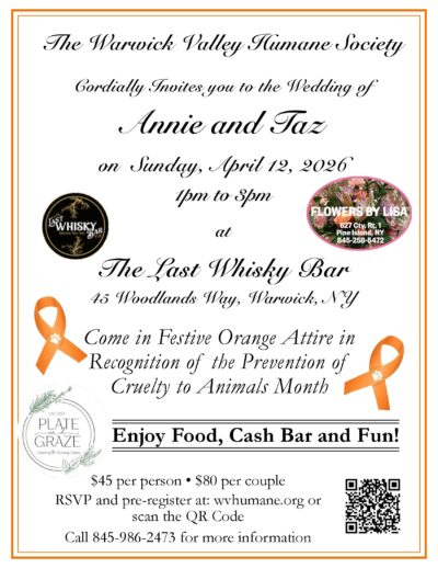 The Warwick Valley Humane Society Cordially Invites you to the Wedding of Annie and Taz on Sunday, April 12, 2026 1pm to 3pm The Last Whisky Bar 45 Woodlands Way, Warwick, NY Come in Festive Orange Attire in Recognition of the Prevention of Cruelty to Animals Month $45 per person • $80 per couple RSVP by April 5th pre-register...
